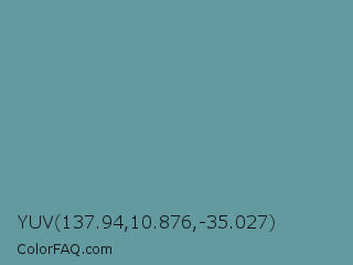 YUV 137.94,10.876,-35.027 Color is a normal cyan color and the nearest color is Cadet Blue #5f9ea0. Hex code #629aa0 and RGB value is rgb(98,154,160). In RGB color space, this color is composed of 38% red, 60% green, 63% blue, In CMYK color space, this color is composed of 39% cyan, 4% magenta, 0% yellow , 37% black , In HSL color space, this color has a hue angle of 186° , 25% saturation and 51% lightness.