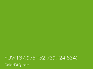 YUV 137.975,-52.739,-24.534 Color is a normal green color and the nearest color is Christi #67a712. Hex code #6ead1f and RGB value is rgb(110,173,31). In RGB color space, this color is composed of 43% red, 68% green, 12% blue, In CMYK color space, this color is composed of 36% cyan, 0% magenta, 82% yellow , 32% black , In HSL color space, this color has a hue angle of 87° , 70% saturation and 40% lightness.