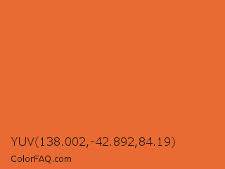 YUV 138.002,-42.892,84.19 Color is a normal orange color and the nearest color is Deep Carrot Orange #e9692c. Hex code #ea6a33 and RGB value is rgb(234,106,51). In RGB color space, this color is composed of 92% red, 42% green, 20% blue, In CMYK color space, this color is composed of 0% cyan, 55% magenta, 78% yellow , 8% black , In HSL color space, this color has a hue angle of 18° , 81% saturation and 56% lightness.