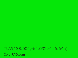 YUV 138.004,-64.092,-116.645 Color is a normal green color and the nearest color is Green #00ff00. Hex code #05e708 and RGB value is rgb(5,231,8). In RGB color space, this color is composed of 2% red, 91% green, 3% blue, In CMYK color space, this color is composed of 98% cyan, 0% magenta, 97% yellow , 9% black , In HSL color space, this color has a hue angle of 121° , 96% saturation and 46% lightness.