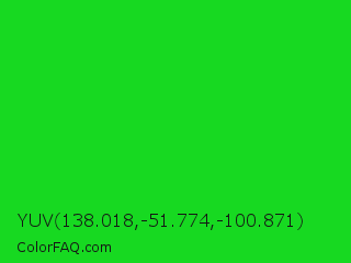 YUV 138.018,-51.774,-100.871 Color is a normal green color and the nearest color is Vivid Malachite #00cc33. Hex code #17d921 and RGB value is rgb(23,217,33). In RGB color space, this color is composed of 9% red, 85% green, 13% blue, In CMYK color space, this color is composed of 89% cyan, 0% magenta, 85% yellow , 15% black , In HSL color space, this color has a hue angle of 123° , 81% saturation and 47% lightness.