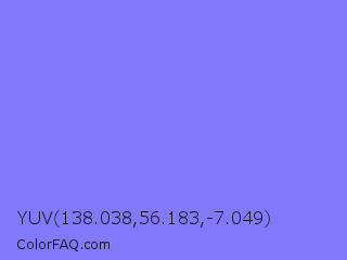 YUV 138.038,56.183,-7.049 Color is a light indigo color and the nearest color is Medium Slate Blue #7b68ee. Hex code #8278fc and RGB value is rgb(130,120,252). In RGB color space, this color is composed of 51% red, 47% green, 99% blue, In CMYK color space, this color is composed of 48% cyan, 52% magenta, 0% yellow , 1% black , In HSL color space, this color has a hue angle of 245° , 96% saturation and 73% lightness.