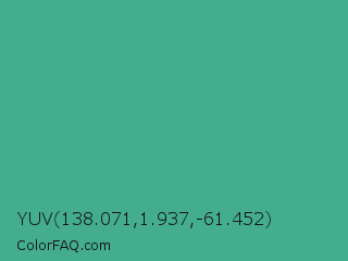 YUV 138.071,1.937,-61.452 Color is a normal green color and the nearest color is Mint #3eb489. Hex code #44ad8e and RGB value is rgb(68,173,142). In RGB color space, this color is composed of 27% red, 68% green, 56% blue, In CMYK color space, this color is composed of 61% cyan, 0% magenta, 18% yellow , 32% black , In HSL color space, this color has a hue angle of 162° , 44% saturation and 47% lightness.