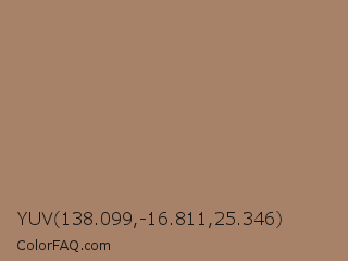 YUV 138.099,-16.811,25.346 Color is a normal orange color and the nearest color is Beaver #9f8170. Hex code #a78268 and RGB value is rgb(167,130,104). In RGB color space, this color is composed of 65% red, 51% green, 41% blue, In CMYK color space, this color is composed of 0% cyan, 22% magenta, 38% yellow , 35% black , In HSL color space, this color has a hue angle of 25° , 26% saturation and 53% lightness.