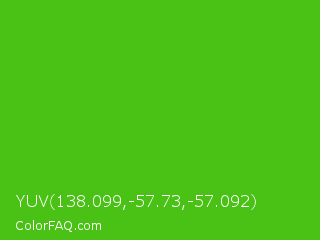 YUV 138.099,-57.73,-57.092 Color is a normal green color and the nearest color is Kelly Green #4cbb17. Hex code #49c215 and RGB value is rgb(73,194,21). In RGB color space, this color is composed of 29% red, 76% green, 8% blue, In CMYK color space, this color is composed of 62% cyan, 0% magenta, 89% yellow , 24% black , In HSL color space, this color has a hue angle of 102° , 80% saturation and 42% lightness.