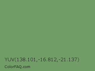 YUV 138.101,-16.812,-21.137 Color is a normal green color and the nearest color is Russian Green #679267. Hex code #729d68 and RGB value is rgb(114,157,104). In RGB color space, this color is composed of 45% red, 62% green, 41% blue, In CMYK color space, this color is composed of 27% cyan, 0% magenta, 34% yellow , 38% black , In HSL color space, this color has a hue angle of 109° , 21% saturation and 51% lightness.