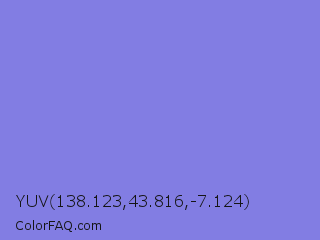 YUV 138.123,43.816,-7.124 Color is a light indigo color and the nearest color is Chetwode Blue #8581d9. Hex code #827de3 and RGB value is rgb(130,125,227). In RGB color space, this color is composed of 51% red, 49% green, 89% blue, In CMYK color space, this color is composed of 43% cyan, 45% magenta, 0% yellow , 11% black , In HSL color space, this color has a hue angle of 243° , 65% saturation and 69% lightness.
