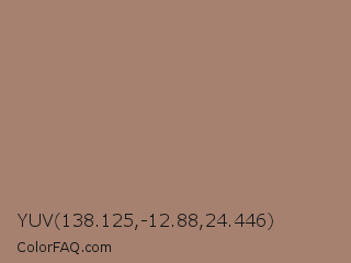 YUV 138.125,-12.88,24.446 Color is a normal orange color and the nearest color is Beaver #9f8170. Hex code #a68170 and RGB value is rgb(166,129,112). In RGB color space, this color is composed of 65% red, 51% green, 44% blue, In CMYK color space, this color is composed of 0% cyan, 22% magenta, 33% yellow , 35% black , In HSL color space, this color has a hue angle of 19° , 23% saturation and 55% lightness.