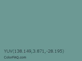 YUV 138.149,3.871,-28.195 Color is a normal cyan color and the nearest color is Juniper #6d9292. Hex code #6a9992 and RGB value is rgb(106,153,146). In RGB color space, this color is composed of 42% red, 60% green, 57% blue, In CMYK color space, this color is composed of 31% cyan, 0% magenta, 5% yellow , 40% black , In HSL color space, this color has a hue angle of 171° , 19% saturation and 51% lightness.