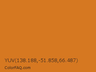 YUV 138.188,-51.858,66.487 Color is a normal orange color and the nearest color is Ochre #cc7722. Hex code #d67821 and RGB value is rgb(214,120,33). In RGB color space, this color is composed of 84% red, 47% green, 13% blue, In CMYK color space, this color is composed of 0% cyan, 44% magenta, 85% yellow , 16% black , In HSL color space, this color has a hue angle of 29° , 73% saturation and 48% lightness.
