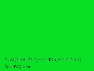 YUV 138.212,-49.405,-114.196 Color is a normal green color and the nearest color is Vivid Malachite #00cc33. Hex code #08e026 and RGB value is rgb(8,224,38). In RGB color space, this color is composed of 3% red, 88% green, 15% blue, In CMYK color space, this color is composed of 96% cyan, 0% magenta, 83% yellow , 12% black , In HSL color space, this color has a hue angle of 128° , 93% saturation and 45% lightness.