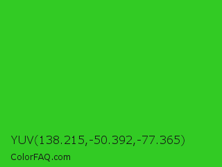 YUV 138.215,-50.392,-77.365 Color is a normal green color and the nearest color is Lime Green #32cd32. Hex code #32cb24 and RGB value is rgb(50,203,36). In RGB color space, this color is composed of 20% red, 80% green, 14% blue, In CMYK color space, this color is composed of 75% cyan, 0% magenta, 82% yellow , 20% black , In HSL color space, this color has a hue angle of 115° , 70% saturation and 47% lightness.