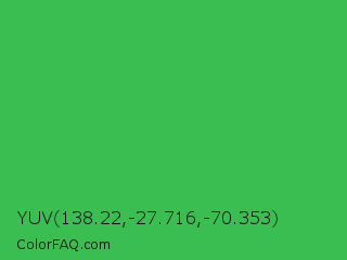 YUV 138.22,-27.716,-70.353 Color is a normal green color and the nearest color is Chateau Green #40a860. Hex code #3abe52 and RGB value is rgb(58,190,82). In RGB color space, this color is composed of 23% red, 75% green, 32% blue, In CMYK color space, this color is composed of 69% cyan, 0% magenta, 57% yellow , 25% black , In HSL color space, this color has a hue angle of 131° , 53% saturation and 49% lightness.