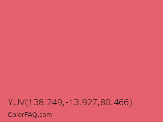 YUV 138.249,-13.927,80.466 Color is a light red color and the nearest color is Light Carmine Pink #e66771. Hex code #e6616e and RGB value is rgb(230,97,110). In RGB color space, this color is composed of 90% red, 38% green, 43% blue, In CMYK color space, this color is composed of 0% cyan, 58% magenta, 52% yellow , 10% black , In HSL color space, this color has a hue angle of 354° , 73% saturation and 64% lightness.