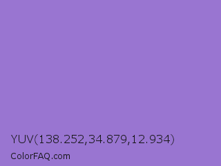 YUV 138.252,34.879,12.934 Color is a light violet color and the nearest color is Lilac Bush #9874d3. Hex code #9975d1 and RGB value is rgb(153,117,209). In RGB color space, this color is composed of 60% red, 46% green, 82% blue, In CMYK color space, this color is composed of 27% cyan, 44% magenta, 0% yellow , 18% black , In HSL color space, this color has a hue angle of 263° , 50% saturation and 64% lightness.