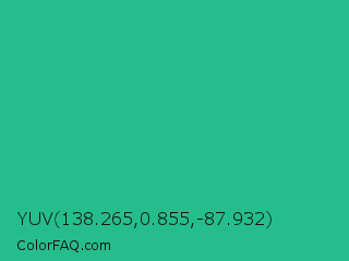 YUV 138.265,0.855,-87.932 Color is a normal green color and the nearest color is Mountain Meadow #30ba8f. Hex code #26bd8c and RGB value is rgb(38,189,140). In RGB color space, this color is composed of 15% red, 74% green, 55% blue, In CMYK color space, this color is composed of 80% cyan, 0% magenta, 26% yellow , 26% black , In HSL color space, this color has a hue angle of 161° , 67% saturation and 45% lightness.