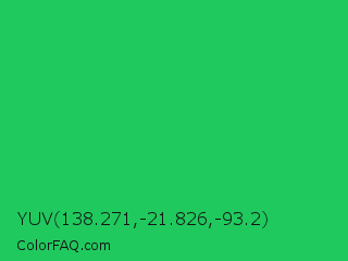 YUV 138.271,-21.826,-93.2 Color is a normal green color and the nearest color is Malachite #0bda51. Hex code #20c95e and RGB value is rgb(32,201,94). In RGB color space, this color is composed of 13% red, 79% green, 37% blue, In CMYK color space, this color is composed of 84% cyan, 0% magenta, 53% yellow , 21% black , In HSL color space, this color has a hue angle of 142° , 73% saturation and 46% lightness.