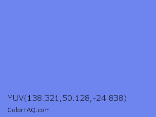 YUV 138.321,50.128,-24.838 Color is a light blue color and the nearest color is Cornflower Blue #6495ed. Hex code #6e85f0 and RGB value is rgb(110,133,240). In RGB color space, this color is composed of 43% red, 52% green, 94% blue, In CMYK color space, this color is composed of 54% cyan, 45% magenta, 0% yellow , 6% black , In HSL color space, this color has a hue angle of 229° , 81% saturation and 69% lightness.