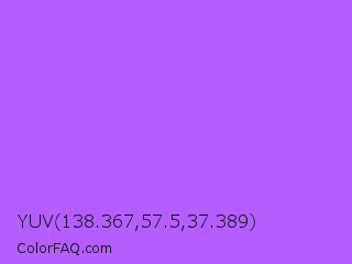 YUV 138.367,57.5,37.389 Color is a light purple color and the nearest color is Navy Purple #9457eb. Hex code #b55eff and RGB value is rgb(181,94,255). In RGB color space, this color is composed of 71% red, 37% green, 100% blue, In CMYK color space, this color is composed of 29% cyan, 63% magenta, 0% yellow , 0% black , In HSL color space, this color has a hue angle of 272° , 100% saturation and 68% lightness.