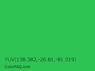 YUV 138.382,-26.81,-81.019 Color is a normal green color and the nearest color is UFO Green #3cd070. Hex code #2ec454 and RGB value is rgb(46,196,84). In RGB color space, this color is composed of 18% red, 77% green, 33% blue, In CMYK color space, this color is composed of 77% cyan, 0% magenta, 57% yellow , 23% black , In HSL color space, this color has a hue angle of 135° , 62% saturation and 47% lightness.