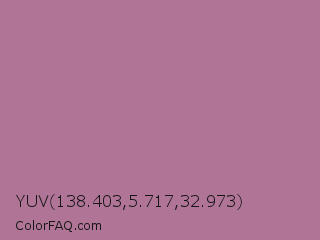 YUV 138.403,5.717,32.973 Color is a normal magenta color and the nearest color is Bouquet #ae809e. Hex code #b07596 and RGB value is rgb(176,117,150). In RGB color space, this color is composed of 69% red, 46% green, 59% blue, In CMYK color space, this color is composed of 0% cyan, 34% magenta, 15% yellow , 31% black , In HSL color space, this color has a hue angle of 326° , 27% saturation and 57% lightness.