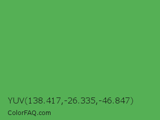 YUV 138.417,-26.335,-46.847 Color is a normal green color and the nearest color is Fruit Salad #4f9d5d. Hex code #55b055 and RGB value is rgb(85,176,85). In RGB color space, this color is composed of 33% red, 69% green, 33% blue, In CMYK color space, this color is composed of 52% cyan, 0% magenta, 52% yellow , 31% black , In HSL color space, this color has a hue angle of 120° , 37% saturation and 51% lightness.
