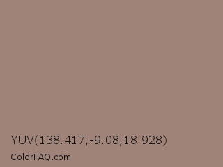 YUV 138.417,-9.08,18.928 Color is a normal orange color and the nearest color is Pharlap #a3807b. Hex code #a08378 and RGB value is rgb(160,131,120). In RGB color space, this color is composed of 63% red, 51% green, 47% blue, In CMYK color space, this color is composed of 0% cyan, 18% magenta, 25% yellow , 37% black , In HSL color space, this color has a hue angle of 17° , 17% saturation and 55% lightness.