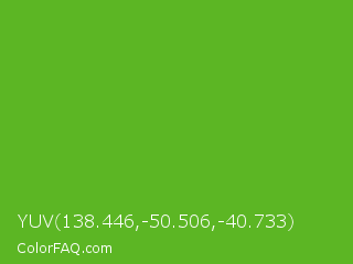 YUV 138.446,-50.506,-40.733 Color is a normal green color and the nearest color is Green RYB #66b032. Hex code #5cb624 and RGB value is rgb(92,182,36). In RGB color space, this color is composed of 36% red, 71% green, 14% blue, In CMYK color space, this color is composed of 49% cyan, 0% magenta, 80% yellow , 29% black , In HSL color space, this color has a hue angle of 97° , 67% saturation and 43% lightness.