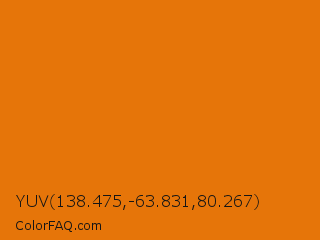 YUV 138.475,-63.831,80.267 Color is a normal orange color and the nearest color is Christine #e7730a. Hex code #e67509 and RGB value is rgb(230,117,9). In RGB color space, this color is composed of 90% red, 46% green, 4% blue, In CMYK color space, this color is composed of 0% cyan, 49% magenta, 96% yellow , 10% black , In HSL color space, this color has a hue angle of 29° , 92% saturation and 47% lightness.