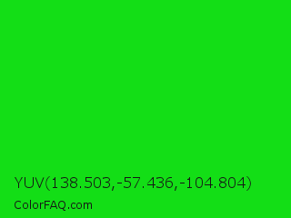 YUV 138.503,-57.436,-104.804 Color is a normal green color and the nearest color is Vivid Malachite #00cc33. Hex code #13de16 and RGB value is rgb(19,222,22). In RGB color space, this color is composed of 7% red, 87% green, 9% blue, In CMYK color space, this color is composed of 91% cyan, 0% magenta, 90% yellow , 13% black , In HSL color space, this color has a hue angle of 121° , 84% saturation and 47% lightness.