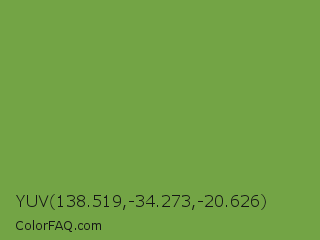 YUV 138.519,-34.273,-20.626 Color is a normal green color and the nearest color is Palm Leaf #6f9940. Hex code #73a445 and RGB value is rgb(115,164,69). In RGB color space, this color is composed of 45% red, 64% green, 27% blue, In CMYK color space, this color is composed of 30% cyan, 0% magenta, 58% yellow , 36% black , In HSL color space, this color has a hue angle of 91° , 41% saturation and 46% lightness.