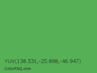 YUV 138.531,-25.898,-46.947 Color is a normal green color and the nearest color is Fruit Salad #4f9d5d. Hex code #55b056 and RGB value is rgb(85,176,86). In RGB color space, this color is composed of 33% red, 69% green, 34% blue, In CMYK color space, this color is composed of 52% cyan, 0% magenta, 51% yellow , 31% black , In HSL color space, this color has a hue angle of 121° , 37% saturation and 51% lightness.