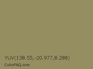 YUV 138.55,-20.977,8.288 Color is a normal yellow color and the nearest color is Avocado Pulp #888d65. Hex code #948e60 and RGB value is rgb(148,142,96). In RGB color space, this color is composed of 58% red, 56% green, 38% blue, In CMYK color space, this color is composed of 0% cyan, 4% magenta, 35% yellow , 42% black , In HSL color space, this color has a hue angle of 53° , 21% saturation and 48% lightness.