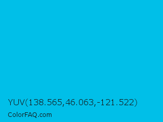 YUV 138.565,46.063,-121.522 Color is a normal cyan color and the nearest color is Cyan Process #00b7eb. Hex code #00bfe8 and RGB value is rgb(0,191,232). In RGB color space, this color is composed of 0% red, 75% green, 91% blue, In CMYK color space, this color is composed of 100% cyan, 18% magenta, 0% yellow , 9% black , In HSL color space, this color has a hue angle of 191° , 100% saturation and 45% lightness.