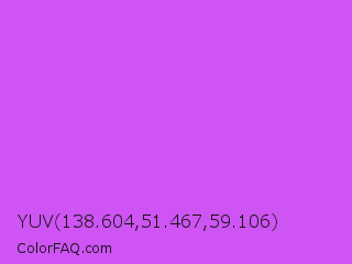 YUV 138.604,51.467,59.106 Color is a light purple color and the nearest color is Heliotrope #df73ff. Hex code #ce54f3 and RGB value is rgb(206,84,243). In RGB color space, this color is composed of 81% red, 33% green, 95% blue, In CMYK color space, this color is composed of 15% cyan, 65% magenta, 0% yellow , 5% black , In HSL color space, this color has a hue angle of 286° , 87% saturation and 64% lightness.