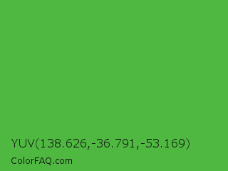 YUV 138.626,-36.791,-53.169 Color is a normal green color and the nearest color is Apple #4fa83d. Hex code #4eb840 and RGB value is rgb(78,184,64). In RGB color space, this color is composed of 31% red, 72% green, 25% blue, In CMYK color space, this color is composed of 58% cyan, 0% magenta, 65% yellow , 28% black , In HSL color space, this color has a hue angle of 113° , 48% saturation and 49% lightness.