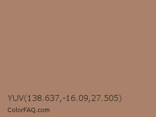 YUV 138.637,-16.09,27.505 Color is a normal orange color and the nearest color is Beaver #9f8170. Hex code #aa816a and RGB value is rgb(170,129,106). In RGB color space, this color is composed of 67% red, 51% green, 42% blue, In CMYK color space, this color is composed of 0% cyan, 24% magenta, 38% yellow , 33% black , In HSL color space, this color has a hue angle of 22° , 27% saturation and 54% lightness.
