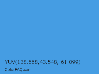 YUV 138.668,43.548,-61.099 Color is a normal blue color and the nearest color is Tufts Blue #3e8ede. Hex code #459de3 and RGB value is rgb(69,157,227). In RGB color space, this color is composed of 27% red, 62% green, 89% blue, In CMYK color space, this color is composed of 70% cyan, 31% magenta, 0% yellow , 11% black , In HSL color space, this color has a hue angle of 207° , 74% saturation and 58% lightness.