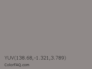 YUV 138.68,-1.321,3.789 Color is a normal red color and the nearest color is Taupe Gray #8b8589. Hex code #8f8988 and RGB value is rgb(143,137,136). In RGB color space, this color is composed of 56% red, 54% green, 53% blue, In CMYK color space, this color is composed of 0% cyan, 4% magenta, 5% yellow , 44% black , In HSL color space, this color has a hue angle of 9° , 3% saturation and 55% lightness.