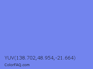 YUV 138.702,48.954,-21.664 Color is a light blue color and the nearest color is Cornflower Blue #6495ed. Hex code #7284ee and RGB value is rgb(114,132,238). In RGB color space, this color is composed of 45% red, 52% green, 93% blue, In CMYK color space, this color is composed of 52% cyan, 45% magenta, 0% yellow , 7% black , In HSL color space, this color has a hue angle of 231° , 78% saturation and 69% lightness.