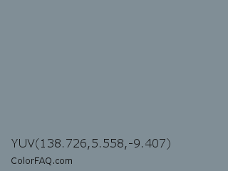 YUV 138.726,5.558,-9.407 Color is a normal blue color and the nearest color is Roman Silver #838996. Hex code #808e96 and RGB value is rgb(128,142,150). In RGB color space, this color is composed of 50% red, 56% green, 59% blue, In CMYK color space, this color is composed of 15% cyan, 5% magenta, 0% yellow , 41% black , In HSL color space, this color has a hue angle of 202° , 9% saturation and 55% lightness.