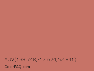 YUV 138.748,-17.624,52.841 Color is a normal red color and the nearest color is Contessa #c6726b. Hex code #c77367 and RGB value is rgb(199,115,103). In RGB color space, this color is composed of 78% red, 45% green, 40% blue, In CMYK color space, this color is composed of 0% cyan, 42% magenta, 48% yellow , 22% black , In HSL color space, this color has a hue angle of 8° , 46% saturation and 59% lightness.