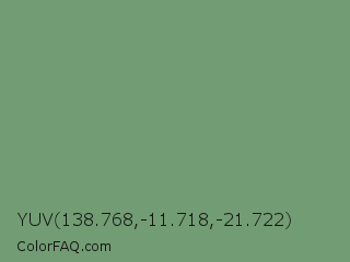 YUV 138.768,-11.718,-21.722 Color is a normal green color and the nearest color is Laurel #749378. Hex code #729c73 and RGB value is rgb(114,156,115). In RGB color space, this color is composed of 45% red, 61% green, 45% blue, In CMYK color space, this color is composed of 27% cyan, 0% magenta, 26% yellow , 39% black , In HSL color space, this color has a hue angle of 121° , 18% saturation and 53% lightness.