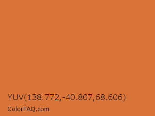 YUV 138.772,-40.807,68.606 Color is a normal orange color and the nearest color is Red Damask #da6a41. Hex code #d97338 and RGB value is rgb(217,115,56). In RGB color space, this color is composed of 85% red, 45% green, 22% blue, In CMYK color space, this color is composed of 0% cyan, 47% magenta, 74% yellow , 15% black , In HSL color space, this color has a hue angle of 22° , 68% saturation and 54% lightness.