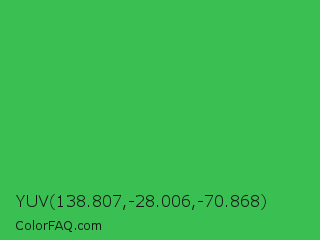 YUV 138.807,-28.006,-70.868 Color is a normal green color and the nearest color is Chateau Green #40a860. Hex code #3abf52 and RGB value is rgb(58,191,82). In RGB color space, this color is composed of 23% red, 75% green, 32% blue, In CMYK color space, this color is composed of 70% cyan, 0% magenta, 57% yellow , 25% black , In HSL color space, this color has a hue angle of 131° , 53% saturation and 49% lightness.