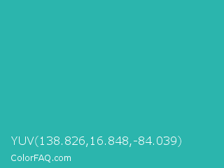 YUV 138.826,16.848,-84.039 Color is a normal cyan color and the nearest color is Light Sea Green #20b2aa. Hex code #2bb5ad and RGB value is rgb(43,181,173). In RGB color space, this color is composed of 17% red, 71% green, 68% blue, In CMYK color space, this color is composed of 76% cyan, 0% magenta, 4% yellow , 29% black , In HSL color space, this color has a hue angle of 177° , 62% saturation and 44% lightness.