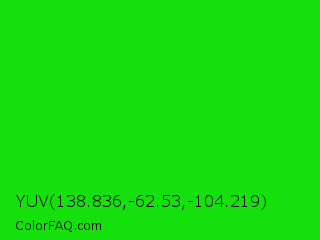 YUV 138.836,-62.53,-104.219 Color is a normal green color and the nearest color is Green #00ff00. Hex code #14e00c and RGB value is rgb(20,224,12). In RGB color space, this color is composed of 8% red, 88% green, 5% blue, In CMYK color space, this color is composed of 91% cyan, 0% magenta, 95% yellow , 12% black , In HSL color space, this color has a hue angle of 118° , 90% saturation and 46% lightness.