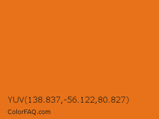 YUV 138.837,-56.122,80.827 Color is a normal orange color and the nearest color is Tango #ed7a1c. Hex code #e77219 and RGB value is rgb(231,114,25). In RGB color space, this color is composed of 91% red, 45% green, 10% blue, In CMYK color space, this color is composed of 0% cyan, 51% magenta, 89% yellow , 9% black , In HSL color space, this color has a hue angle of 26° , 81% saturation and 50% lightness.