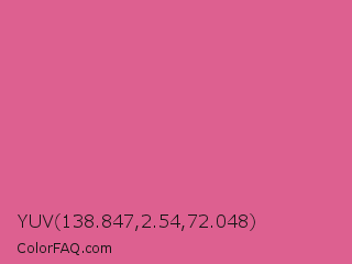 YUV 138.847,2.54,72.048 Color is a light rose color and the nearest color is Blush #de5d83. Hex code #dd6090 and RGB value is rgb(221,96,144). In RGB color space, this color is composed of 87% red, 38% green, 56% blue, In CMYK color space, this color is composed of 0% cyan, 57% magenta, 35% yellow , 13% black , In HSL color space, this color has a hue angle of 337° , 65% saturation and 62% lightness.