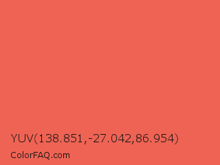 YUV 138.851,-27.042,86.954 Color is a light red color and the nearest color is Sunset Orange #fd5e53. Hex code #ee6354 and RGB value is rgb(238,99,84). In RGB color space, this color is composed of 93% red, 39% green, 33% blue, In CMYK color space, this color is composed of 0% cyan, 58% magenta, 65% yellow , 7% black , In HSL color space, this color has a hue angle of 6° , 82% saturation and 63% lightness.